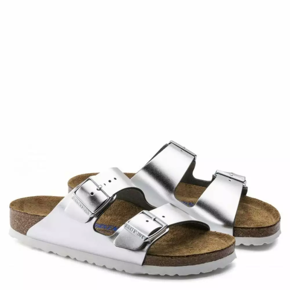 Birkenstock Women’s Arizona Softbed Leather in Metallic Silver is the often imitated, never duplicated, category-defining, two-strap wonder from Birkenstock. A comfort legend and a fashion staple. With adjustable straps and a magical cork footbed that conforms to the shape of your foot, a truly custom fit is as effortless as the classic design.