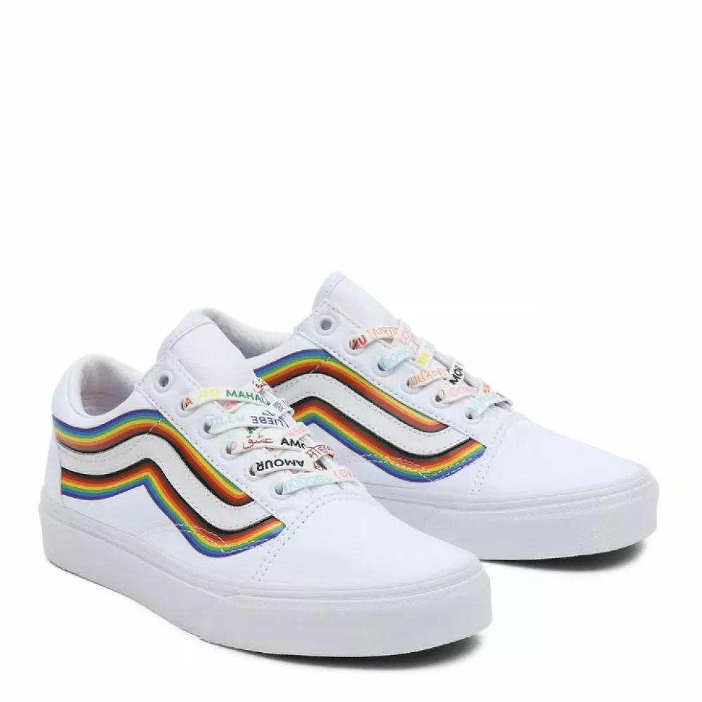 “Off The Wall” Together. This collection was designed to support a more equal and inclusive society, celebrate the LGBTQ+ community, and promote free expression. In recognition of Pride celebrations worldwide, the Pride Old Skool features a Vans twist on all the colors that represent this vibrant community. Playing on the design of our iconic sidestripe, this lace-up shoe showcases the Philly Pride Flag colors on one side and the Trans Flag colors on the other, so that you can celebrate Pride in every step. Along with printed laces, the Pride Old Skool also includes sturdy suede and canvas uppers, supportive padded collars, re-enforced toe caps, and signature rubber waffle outsoles.